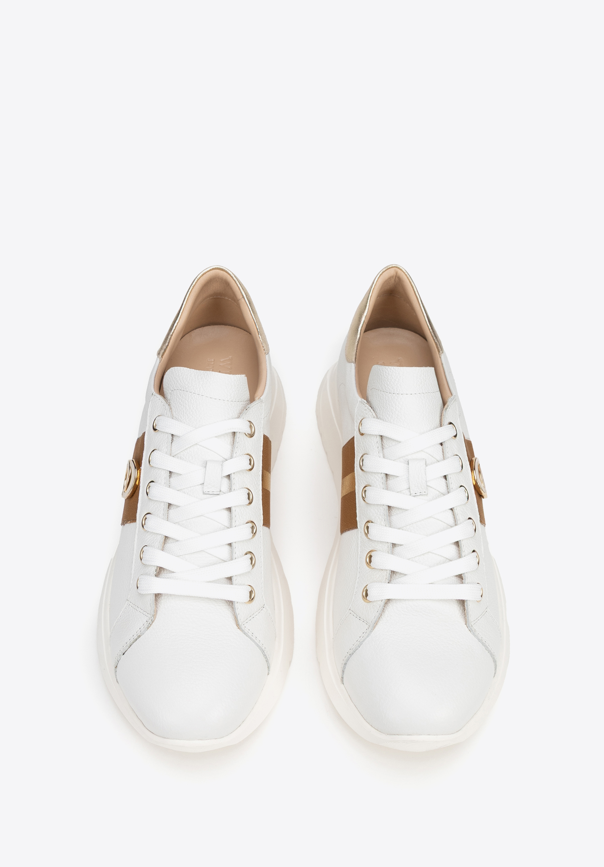 Doprajte si luxus a pohodlie s týmito jedinečnými teniskami! Sú vyrobené z kože a majú lesklé zlaté prvky . Kovové detaily im dodávajú charakter, zatiaľ čo gumová podrážka na platforme nielen zdôrazňuje moderný dizajn, ale zaisťuje pohodlie pri každom kroku. Kožená podšívka a stielka zahalia vaše chodidlá do mäkkosti a zaručia pohodlie po celý deň. Štýlové a praktické – tieto topánky pozdvihnú každý outfit.