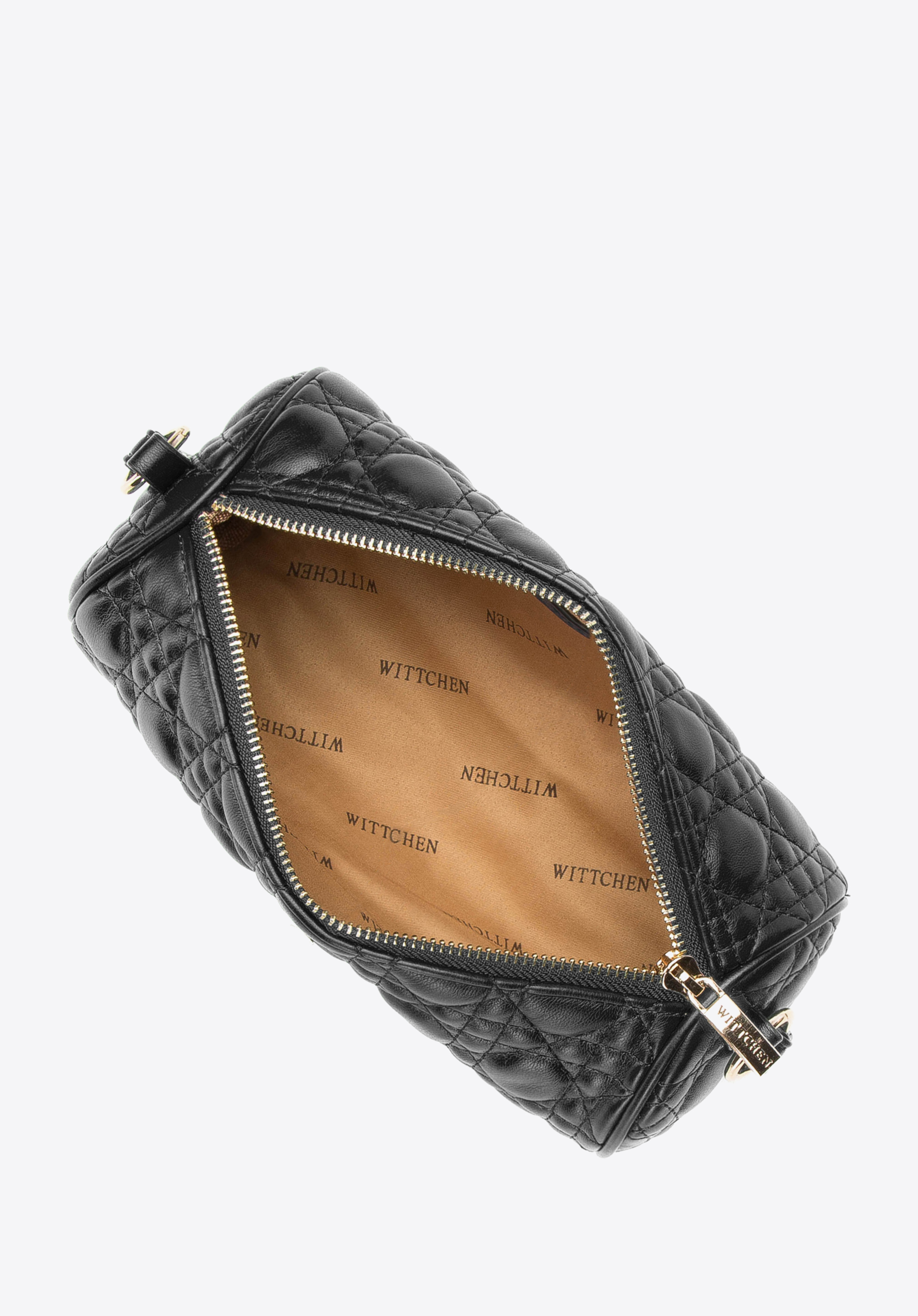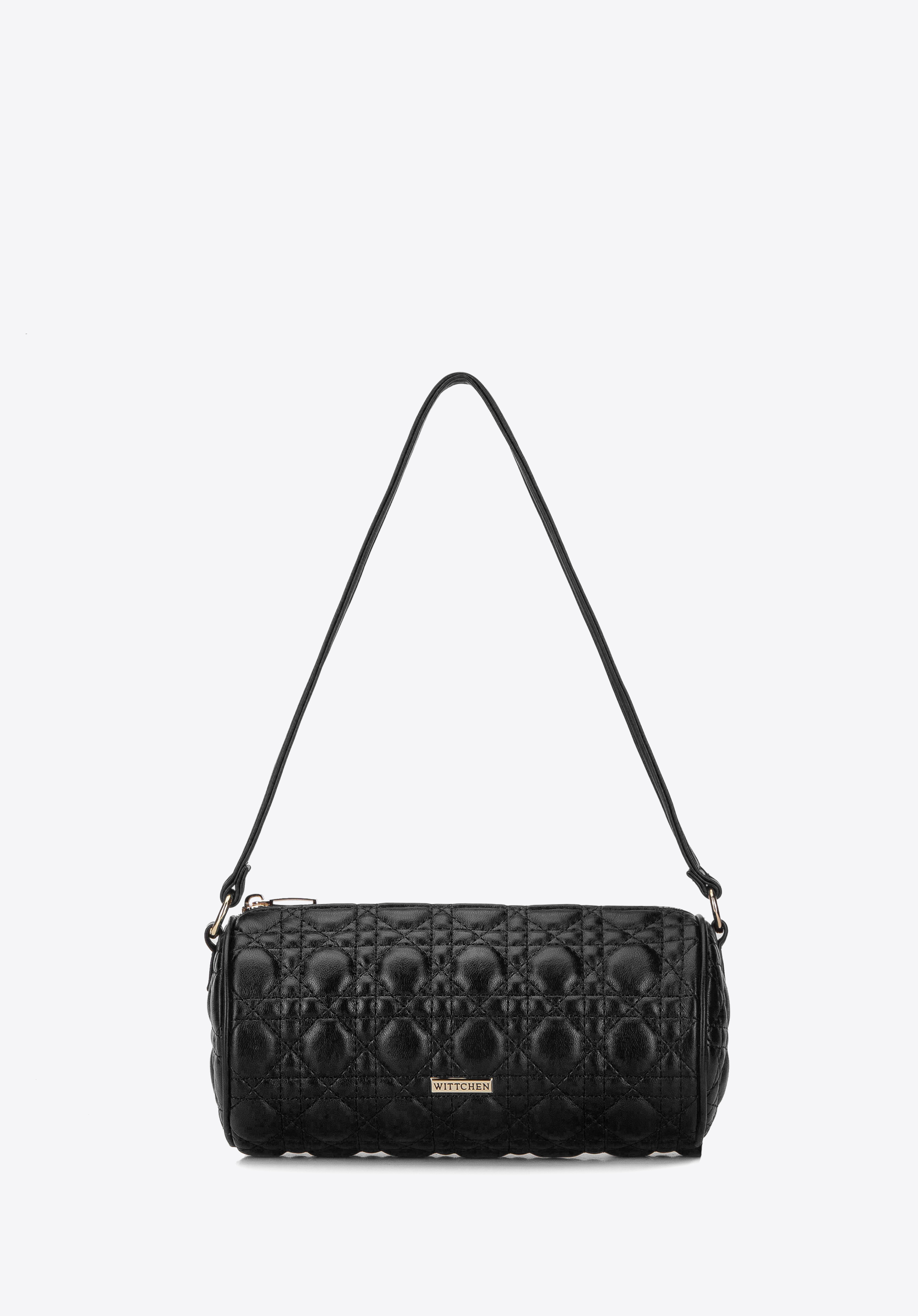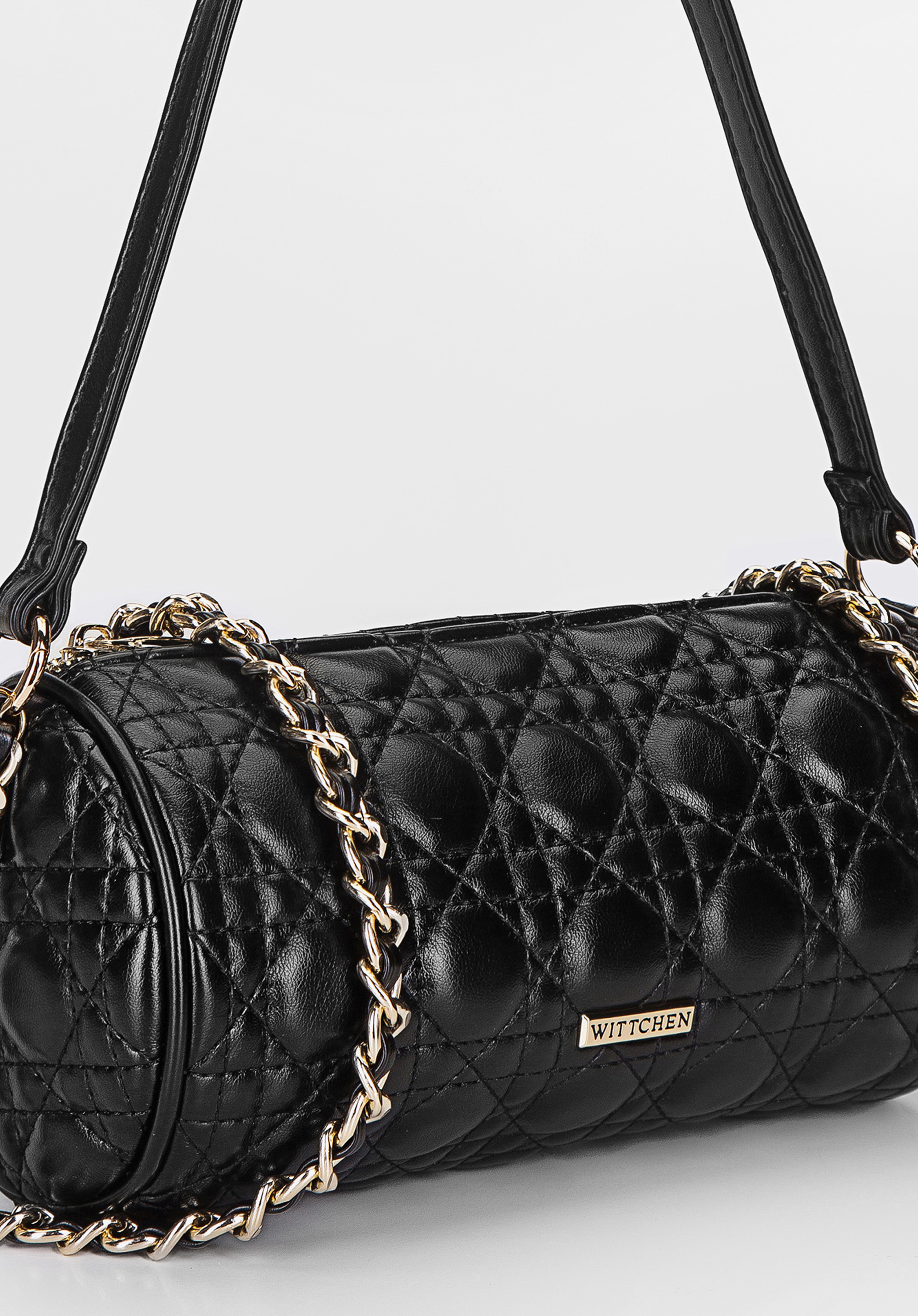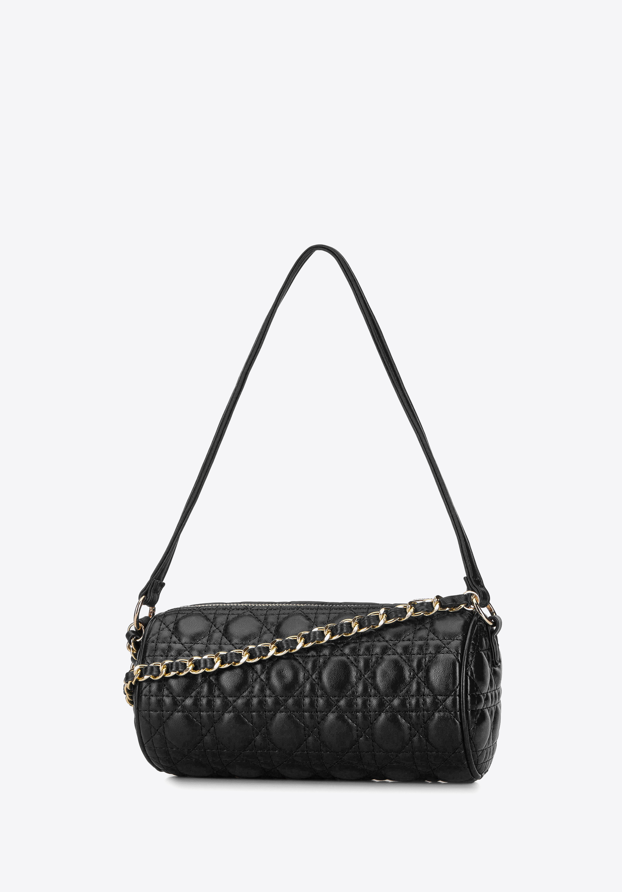 Mäkká, prešívanávečerná kabelkana retiazke s vkusne pretkaným popruhom a druhým - krátkym popruhom do ruky. Popruhy sa dajú ľubovoľne odopínať a pripevňovať pomocou karabínok s tvarom krúžkov. Matná, najkvalitnejšia ekokoža, z ktorej je ušitá, vyzerá perfektne v kombinácii so zlatými detailmi.Okrúhly, krabicový strih, zdobený geometrickým prešívaním, získava moderný ráz, vďaka ktorému váš outfit vynikne medzi ostatnými. Ide o perfektnú kabelku tak k elegantným šatám a lodičkám na ihličkovom podpätku, ako aj k športovej bunde a teniskám.