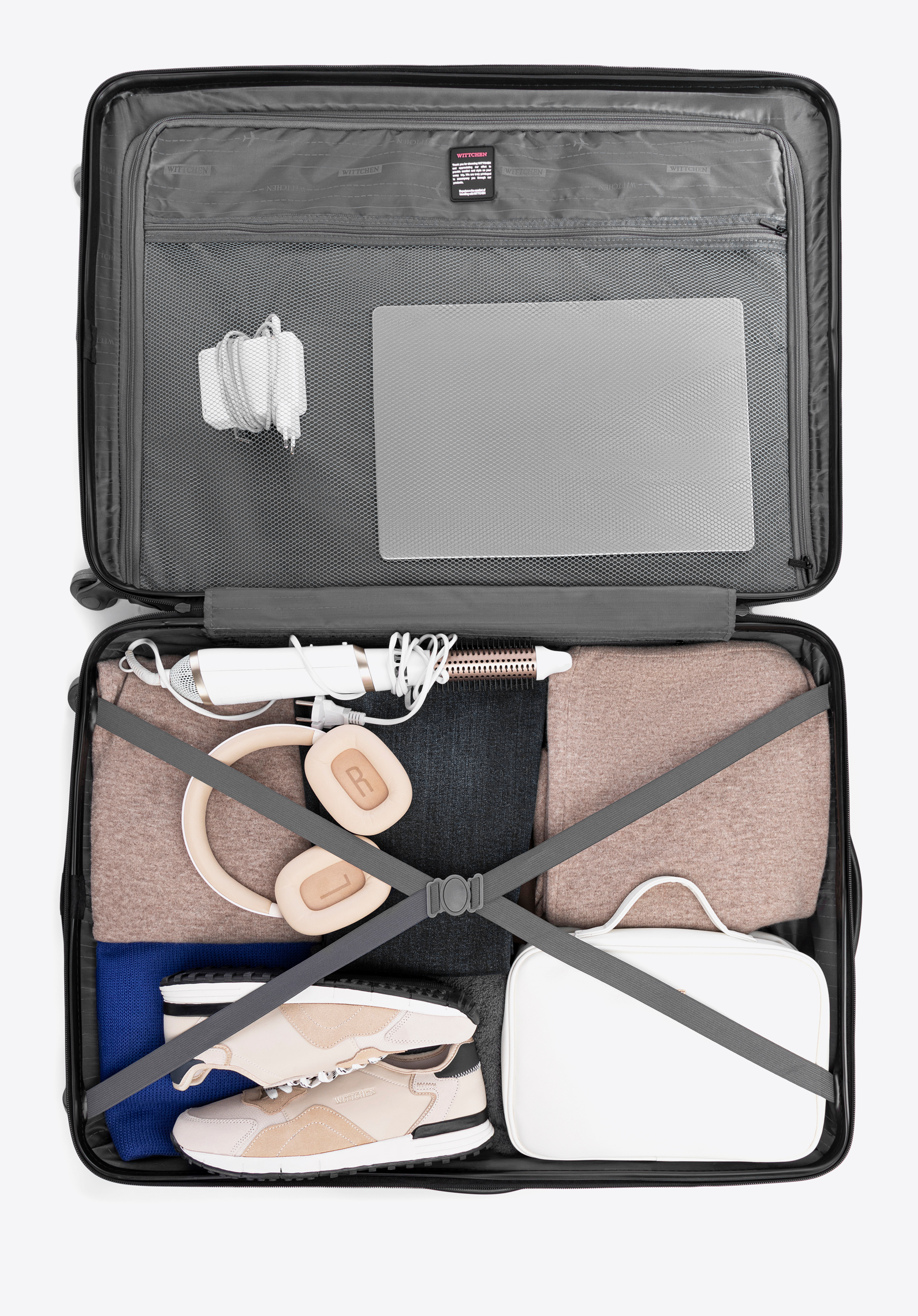 - výsuvná rukoväť a dve gumové rukoväte uľahčujú prenášanie batožiny;