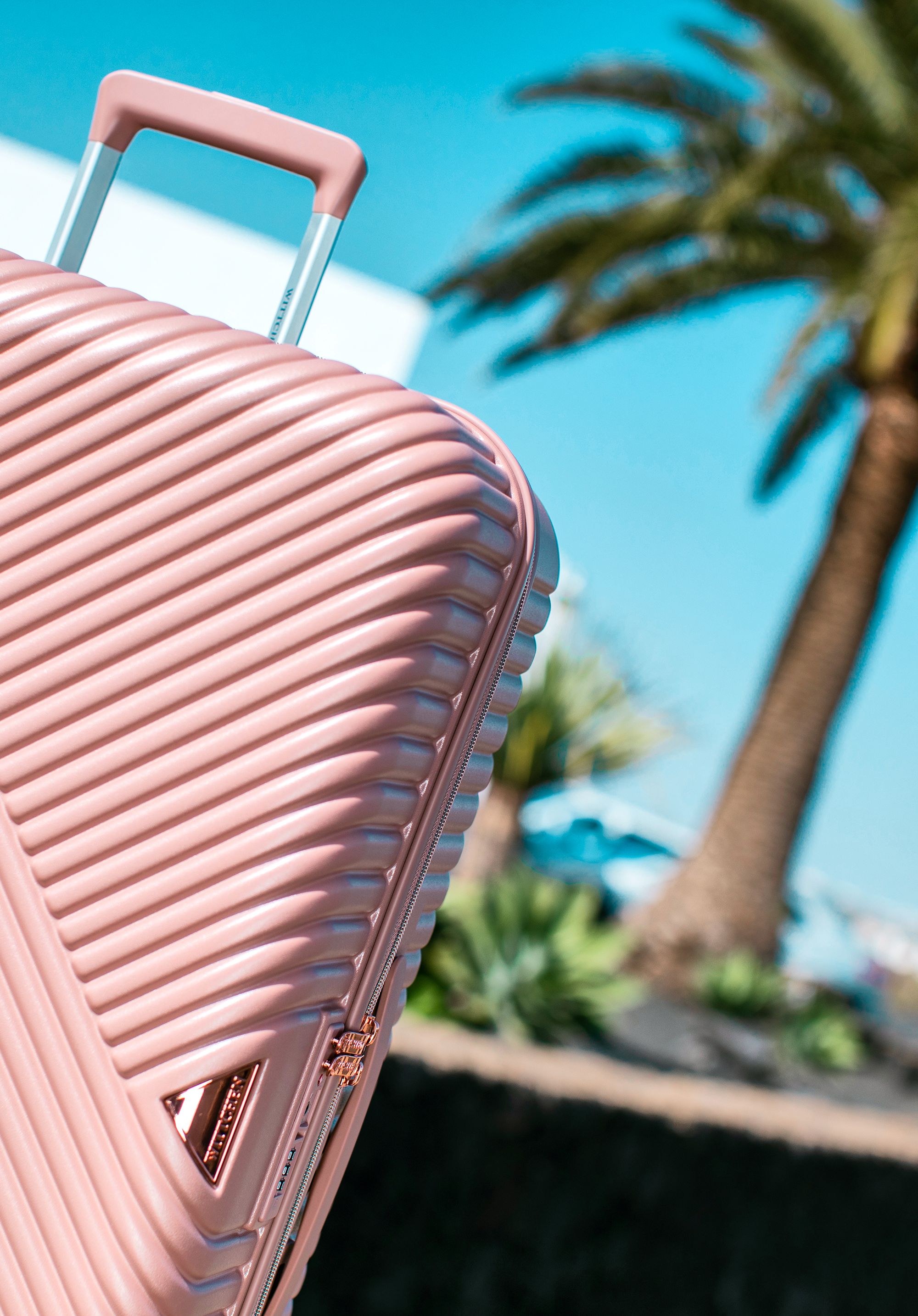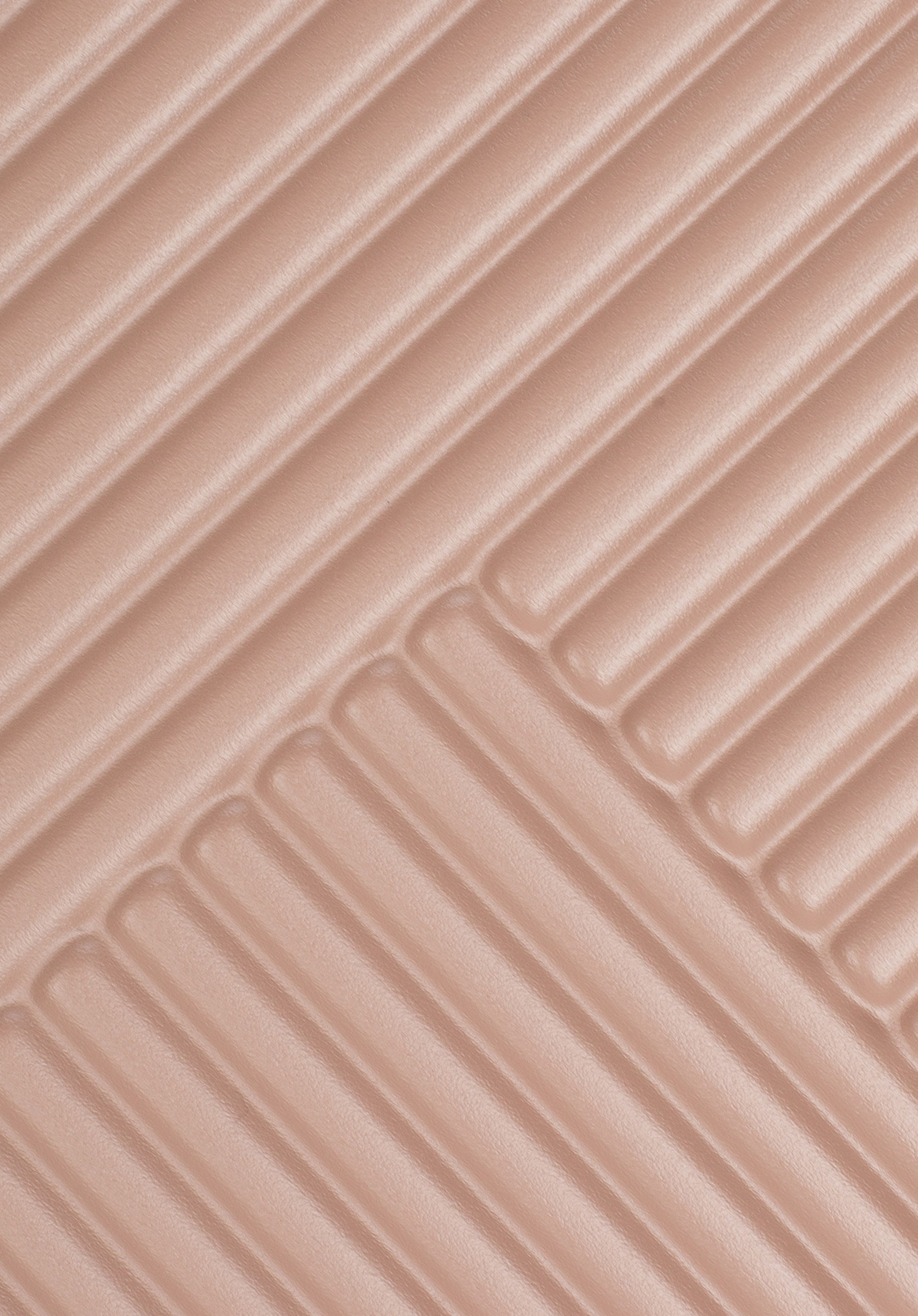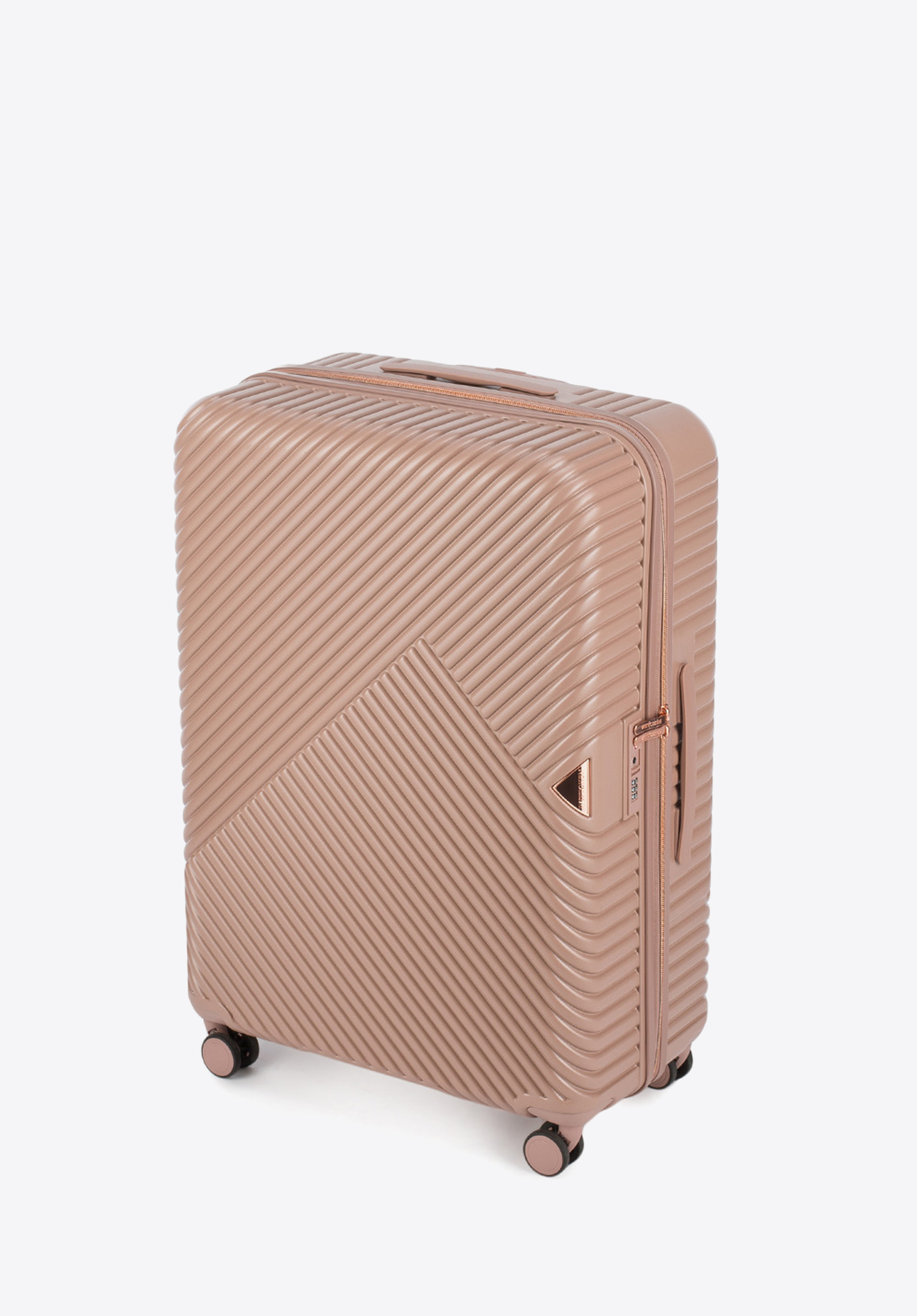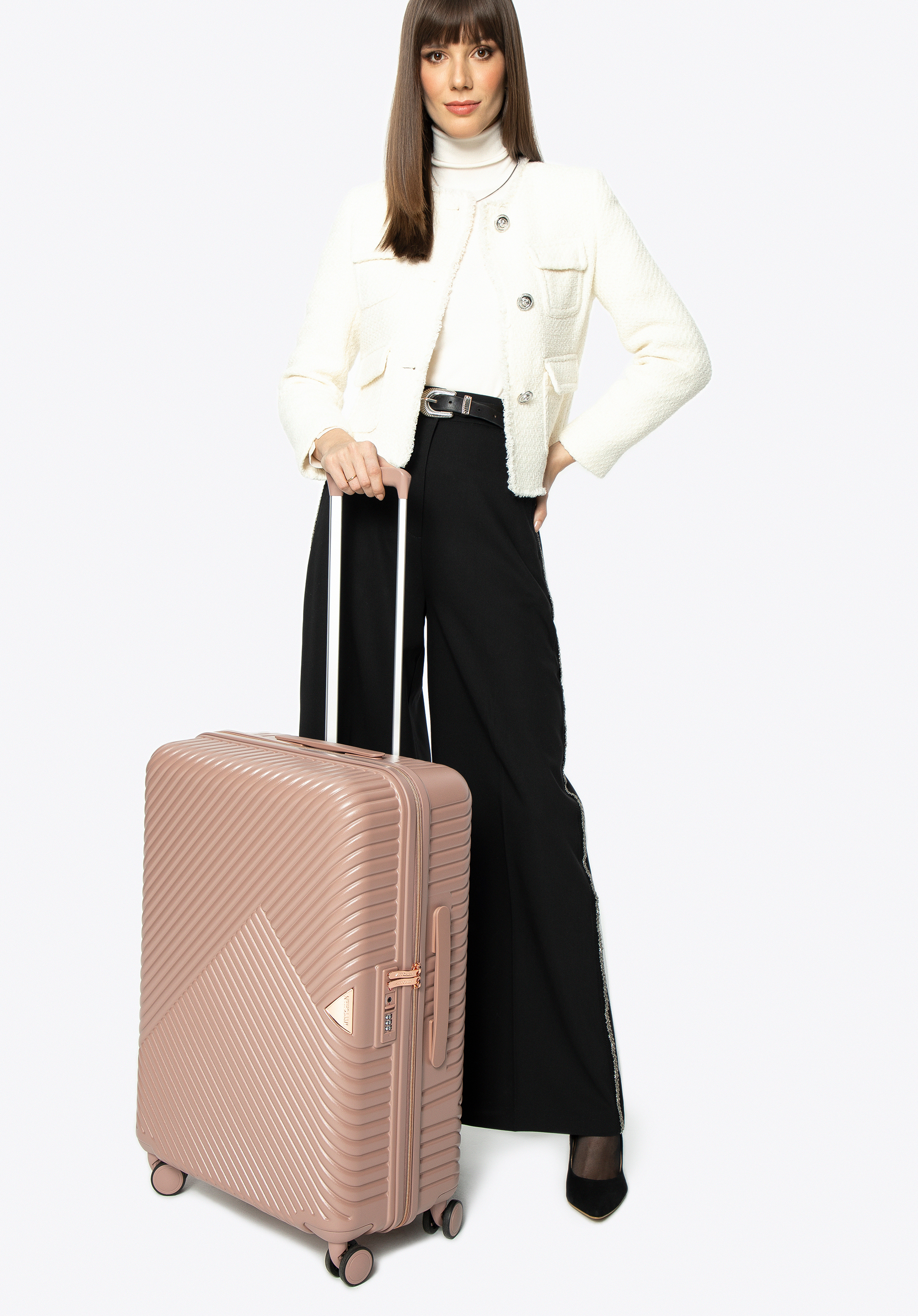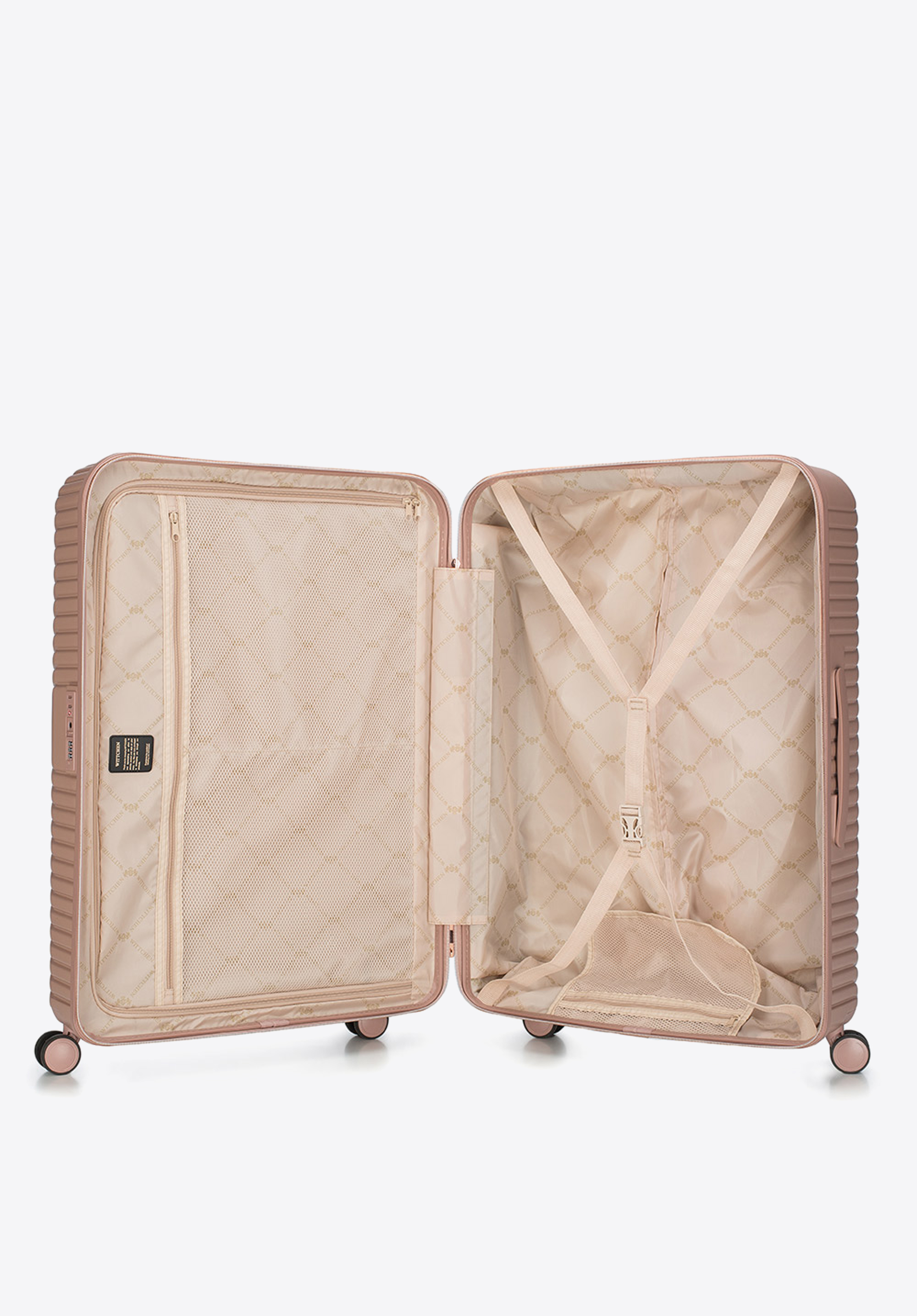 Veľký kufor vytvorený z polykarbonátu s matným povrchom. Ide o dizajnový návrh s lesklým kovaním v ružovo-zlatej farbe. Kolieska vyrobené z plastu ABS s pružnou povrchovou úpravou. Vnútro kufra je pokryté béžovou podšívkou s logom WITTCHEN.