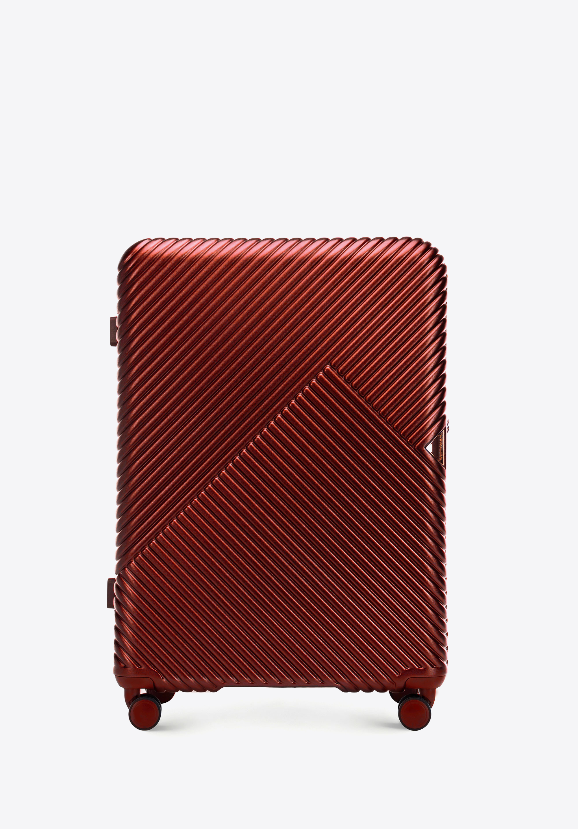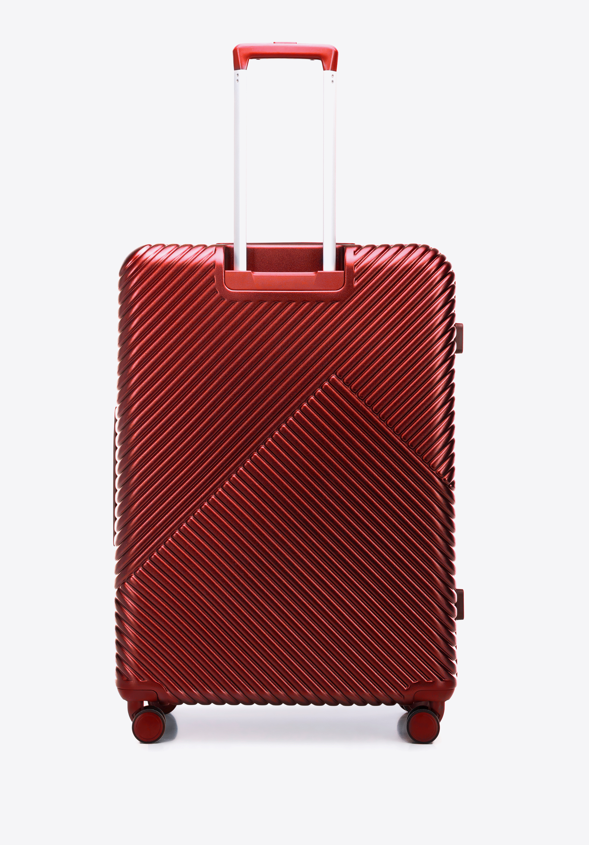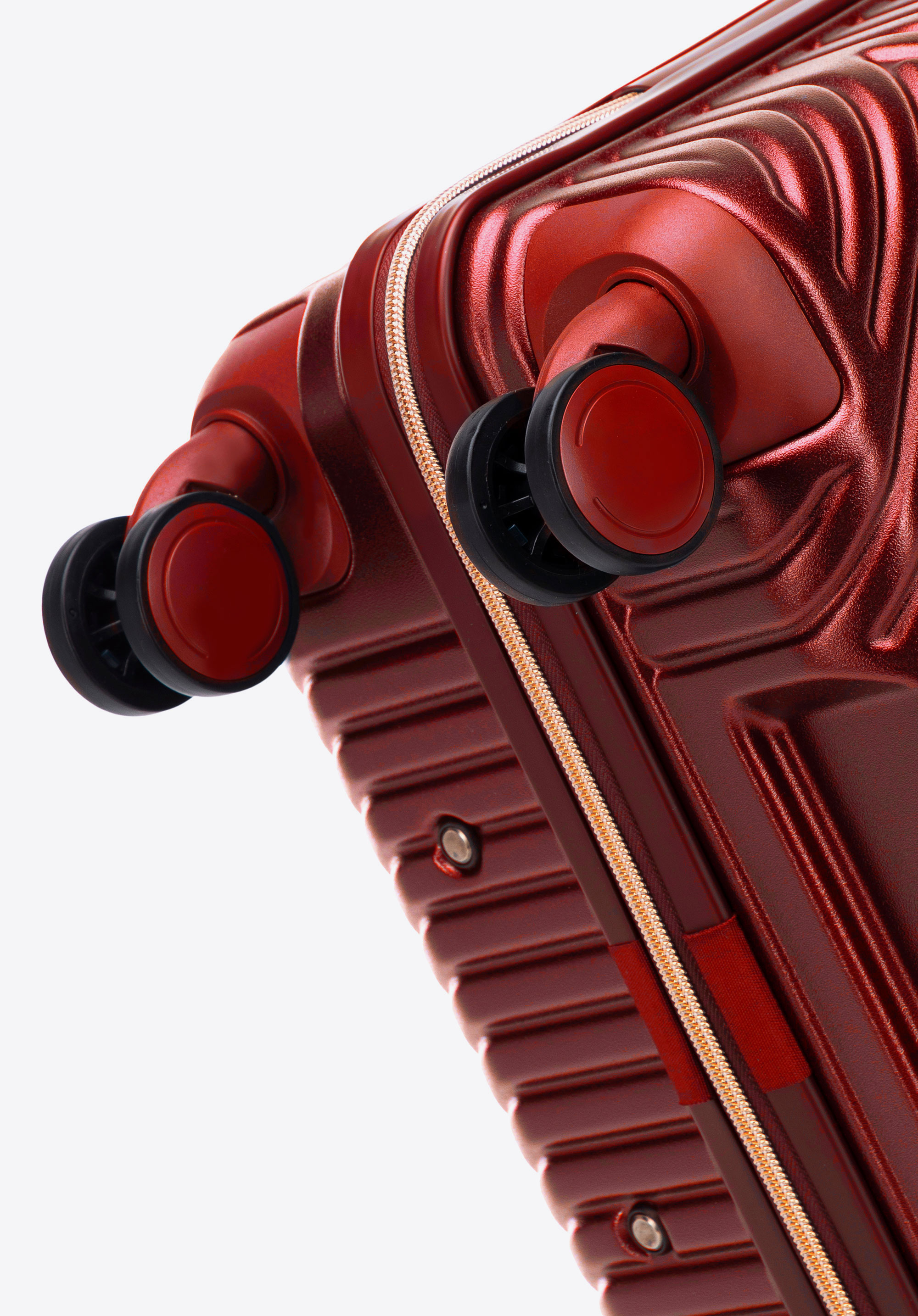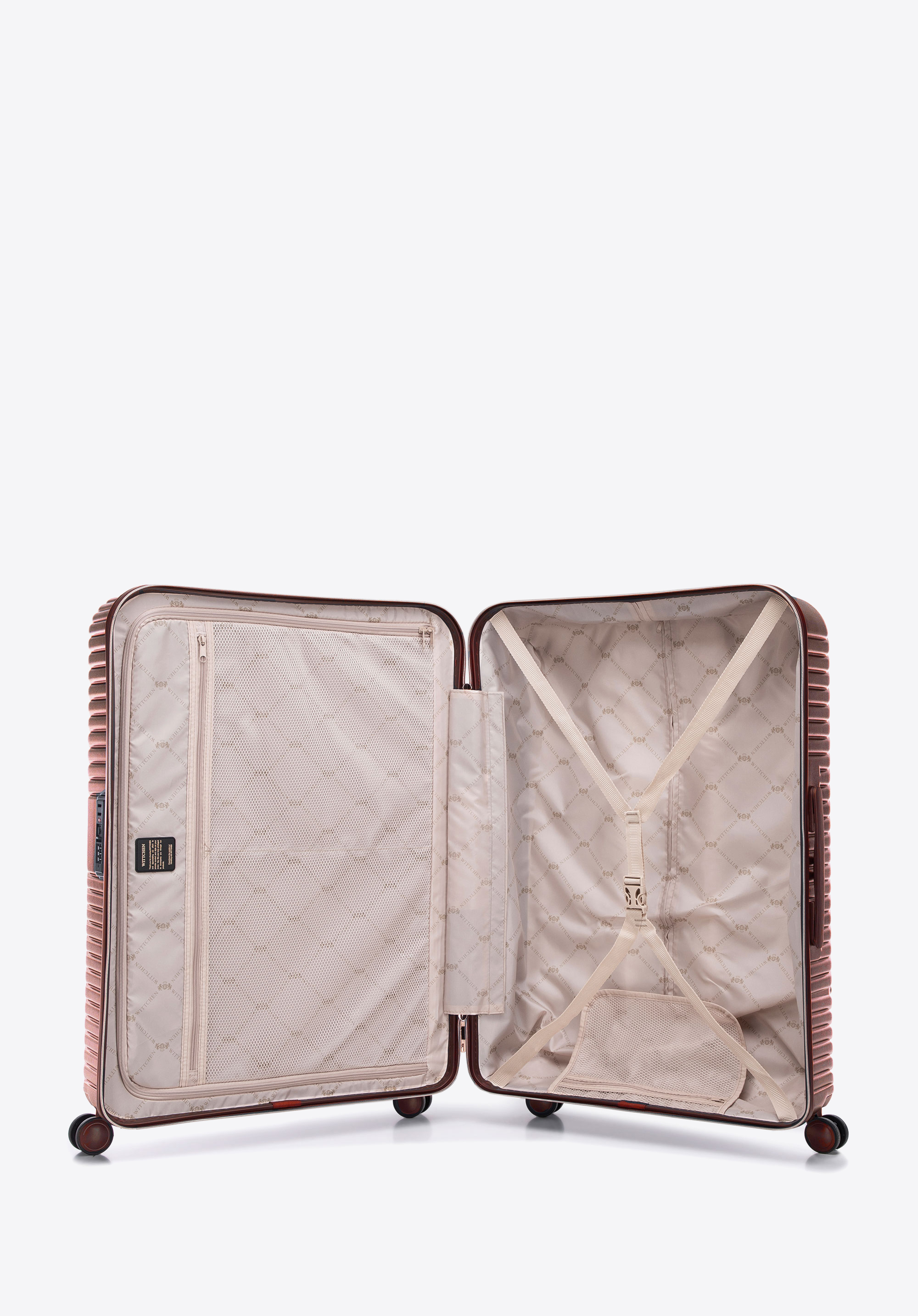 Veľký kufor vytvorený z polykarbonátu s matným povrchom. Ide o dizajnový návrh s lesklým kovaním v ružovo-zlatej farbe. Kolieska vyrobené z plastu ABS s pružnou povrchovou úpravou. Vnútro kufra je pokryté béžovou podšívkou s logom WITTCHEN.